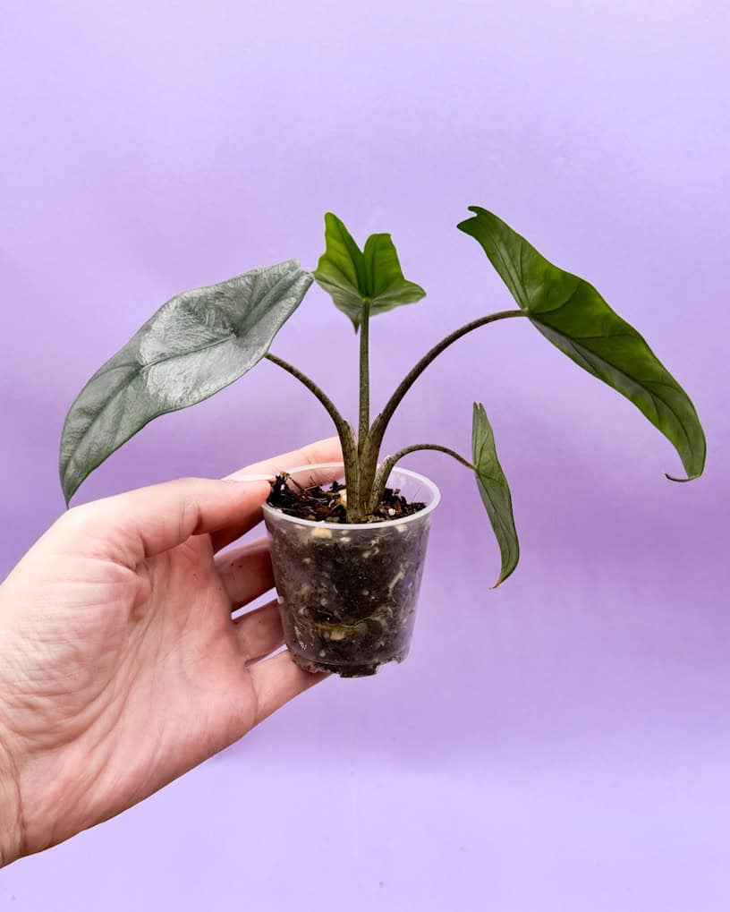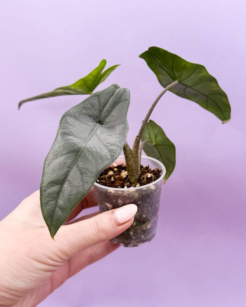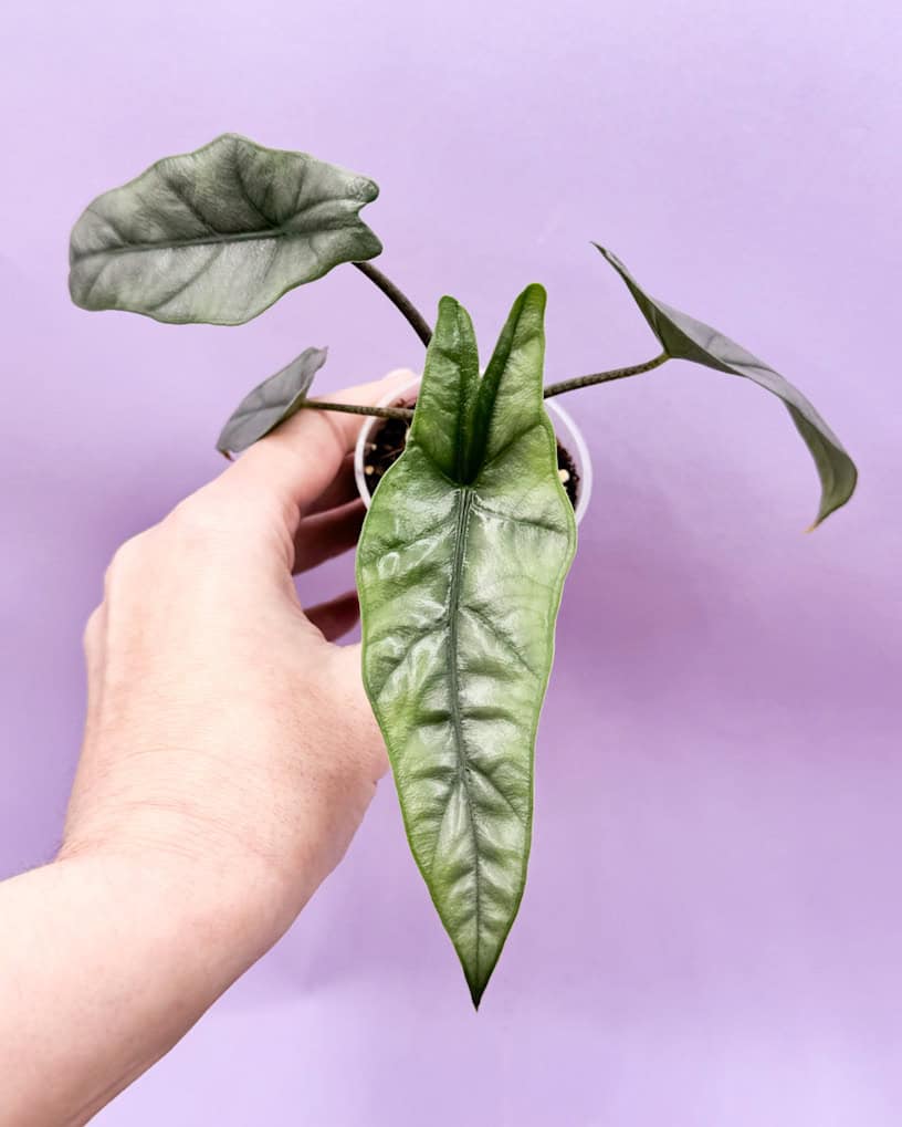La Alocasia Dragon Breath es facilmente reconocible por la apariencia de sus hojas alaargadas y angulosas.