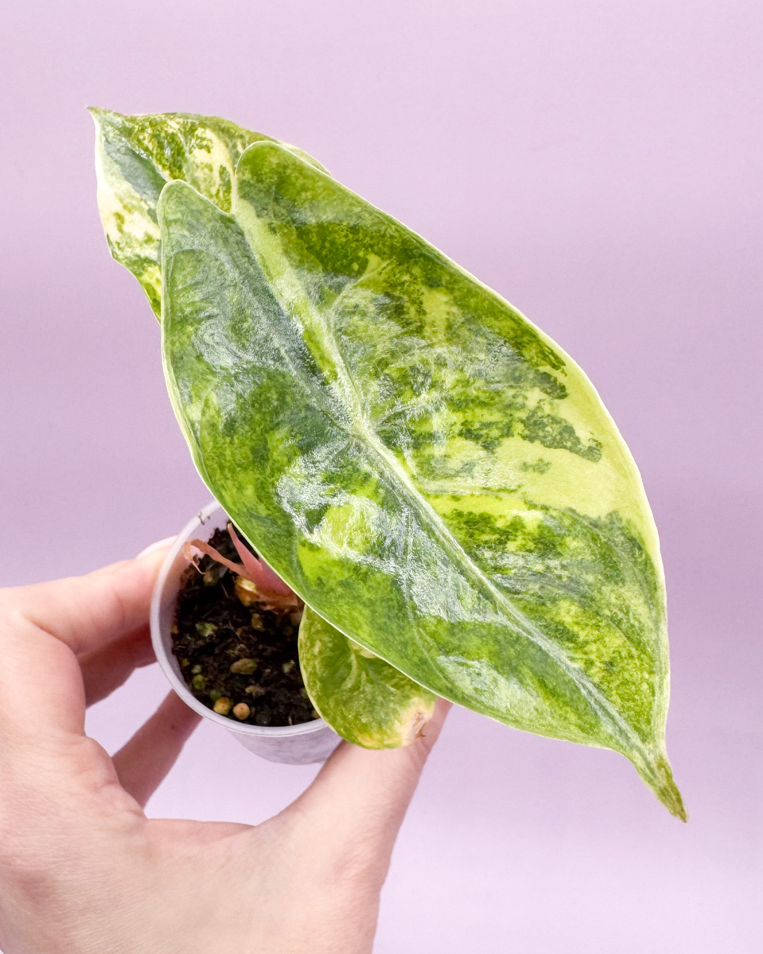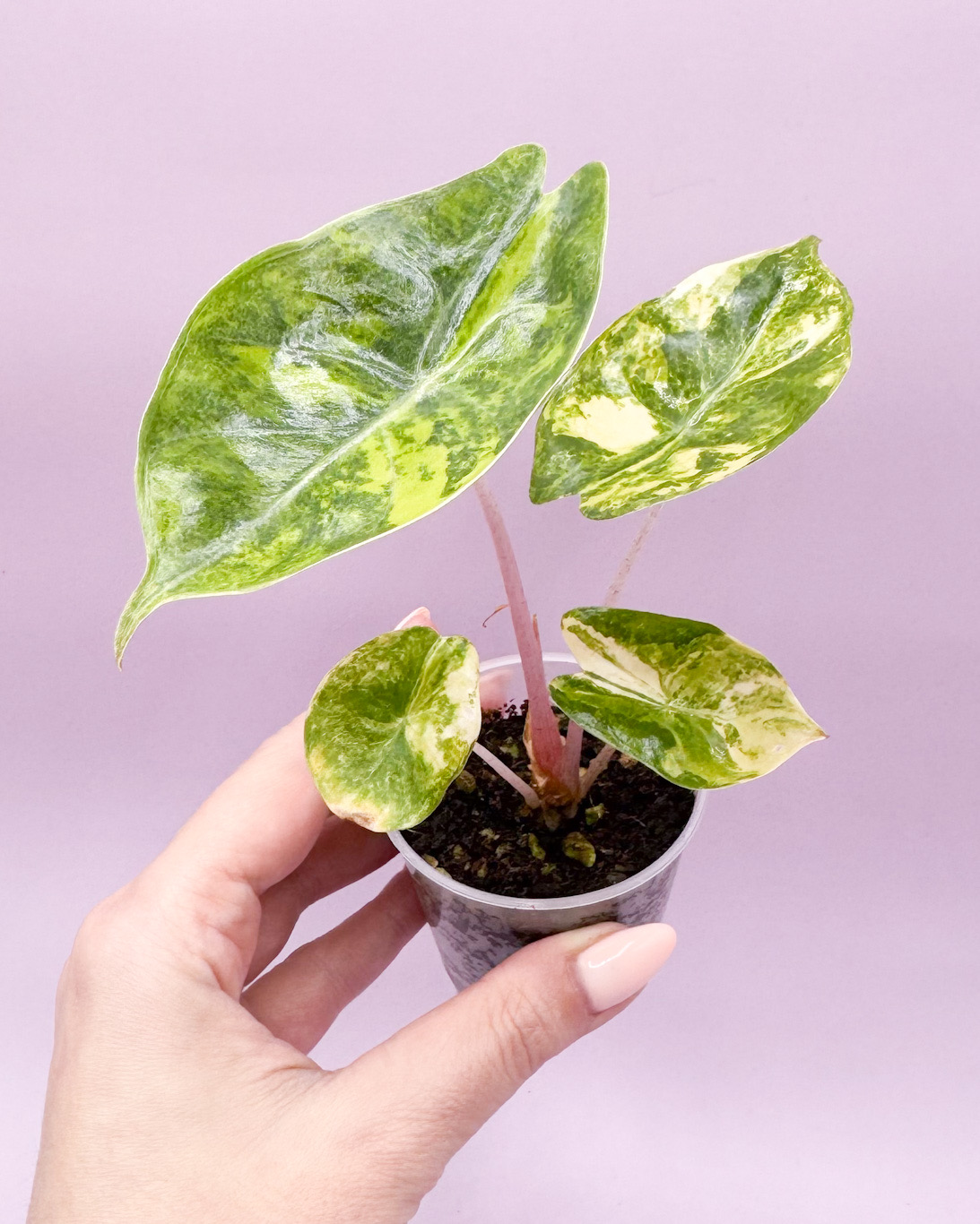 Conocida como Pink Dragon por sus llamativos tallos rosas. En su tamaño adulto es una alocasia de porte medio con hojas fuertes y venas muy marcadas.