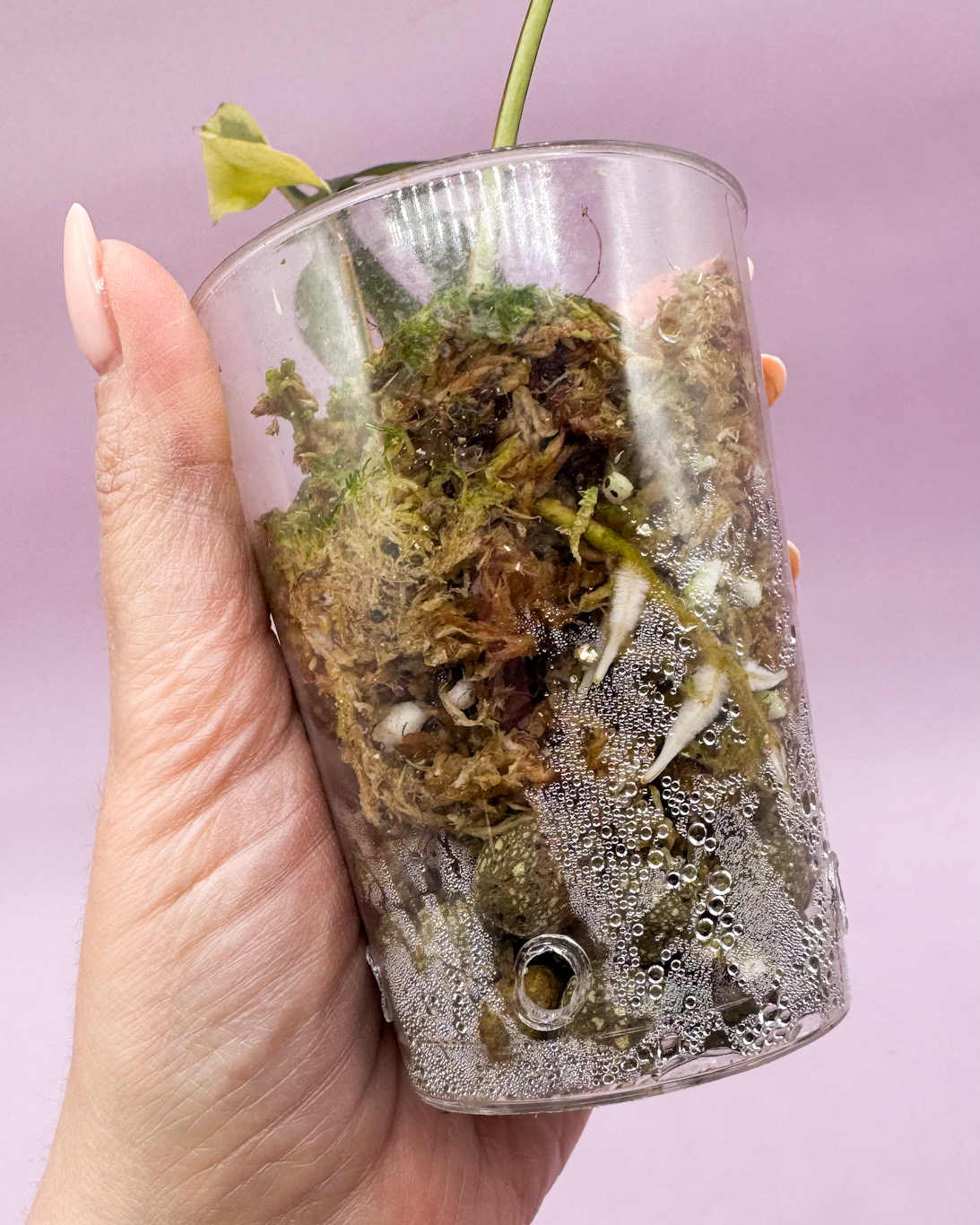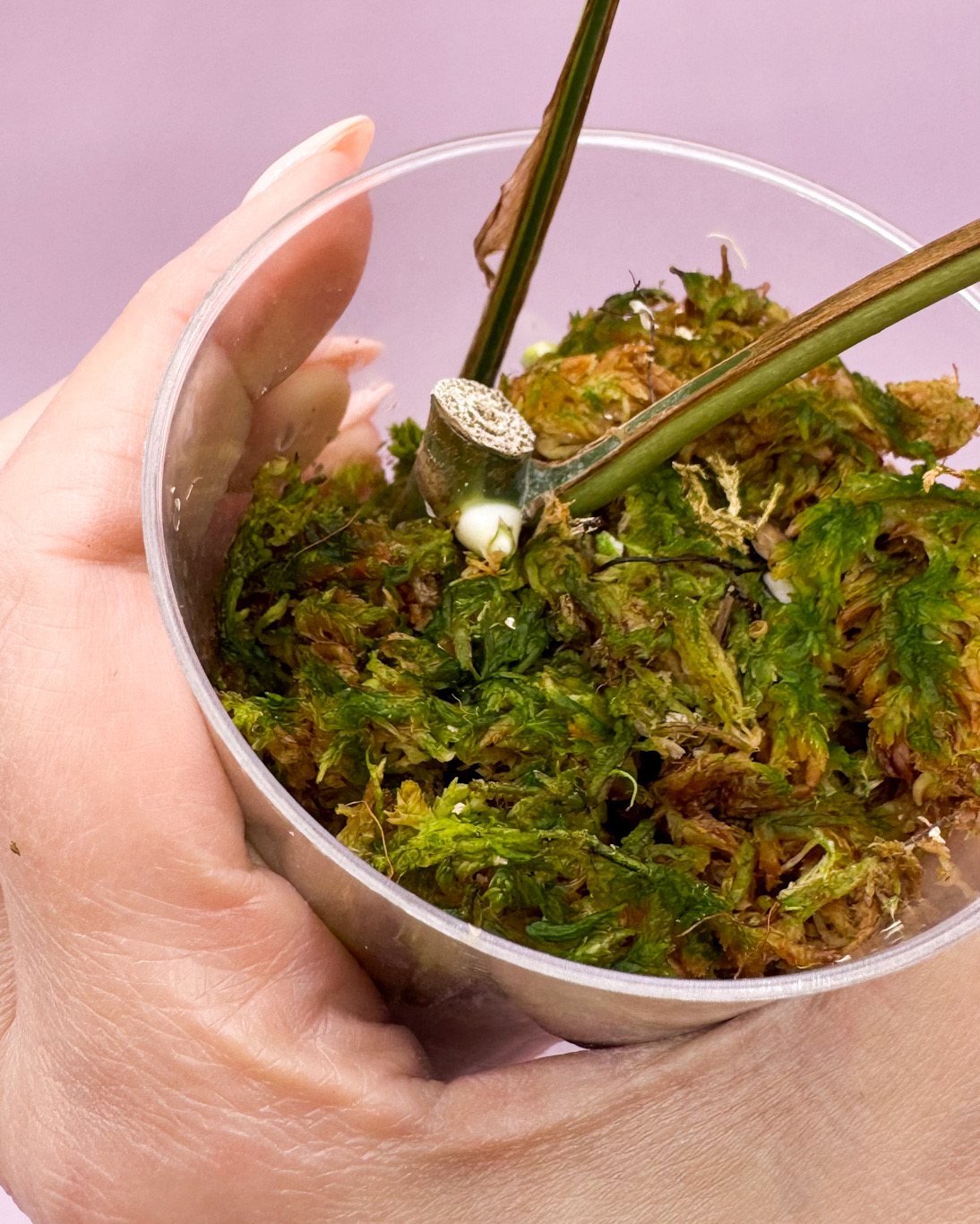 Esqueje enraizado en musgo con punto de crecimiento activo.